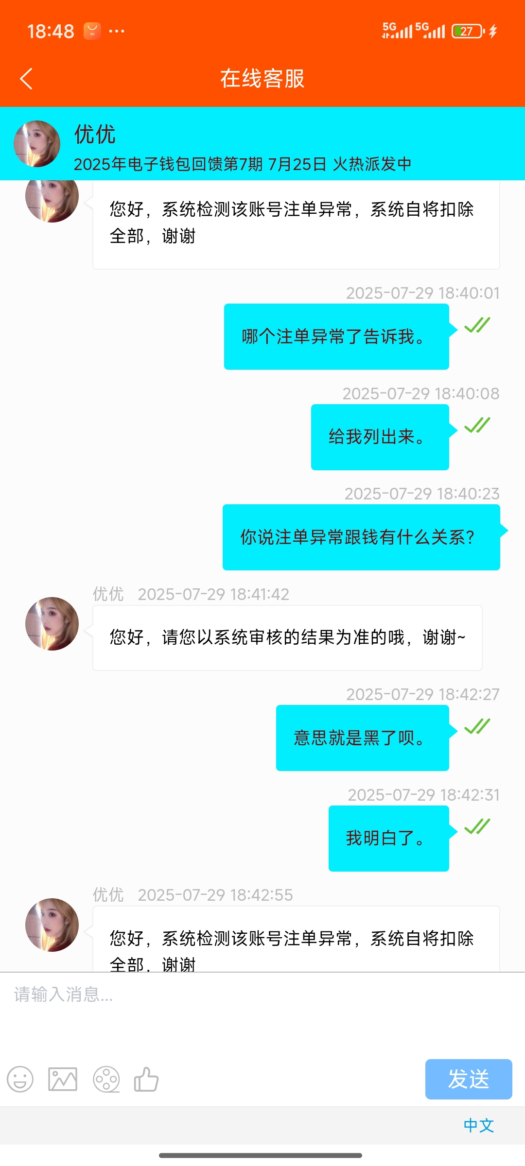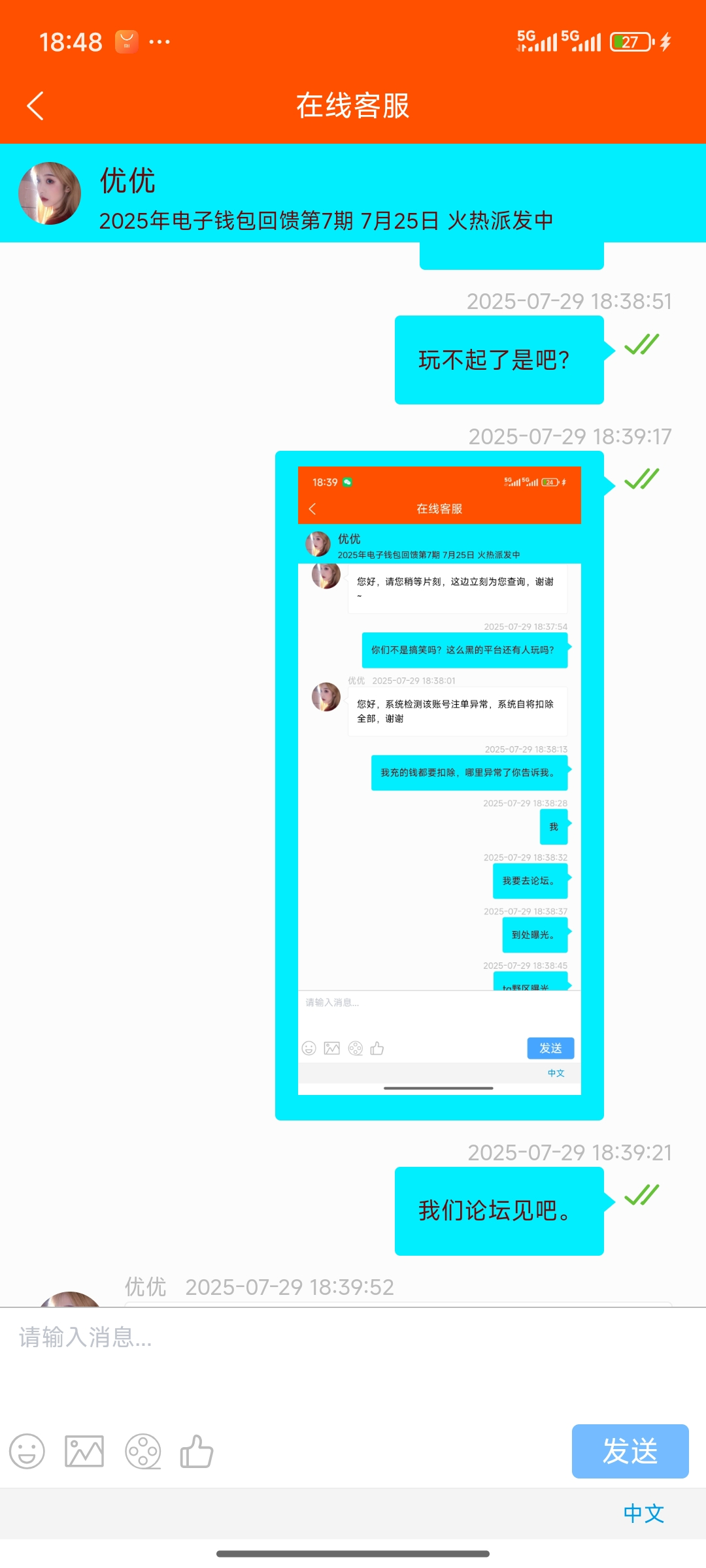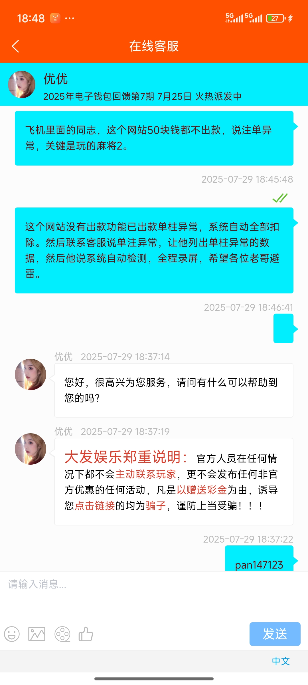 989大发平台。50块钱都不出款。开始充30,后面充20打到50出款,然后说单注一场,让他提供单柱,他又说系统检测自动扣除。现在又封禁账号。希望大家避雷。