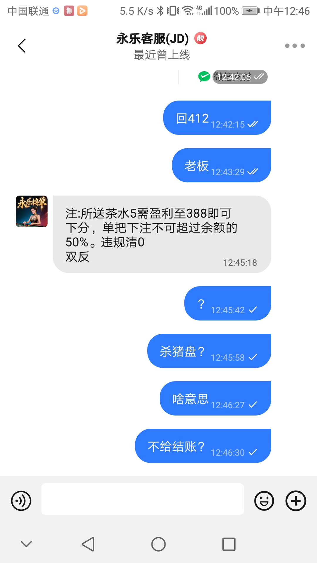 送了5块钱,打到200下分说要满388。打到412下分。跟我说违规操作。老子单把都没下注超过百分之50,把我分数清0却在群里说已经下分。这逼玩意真逗